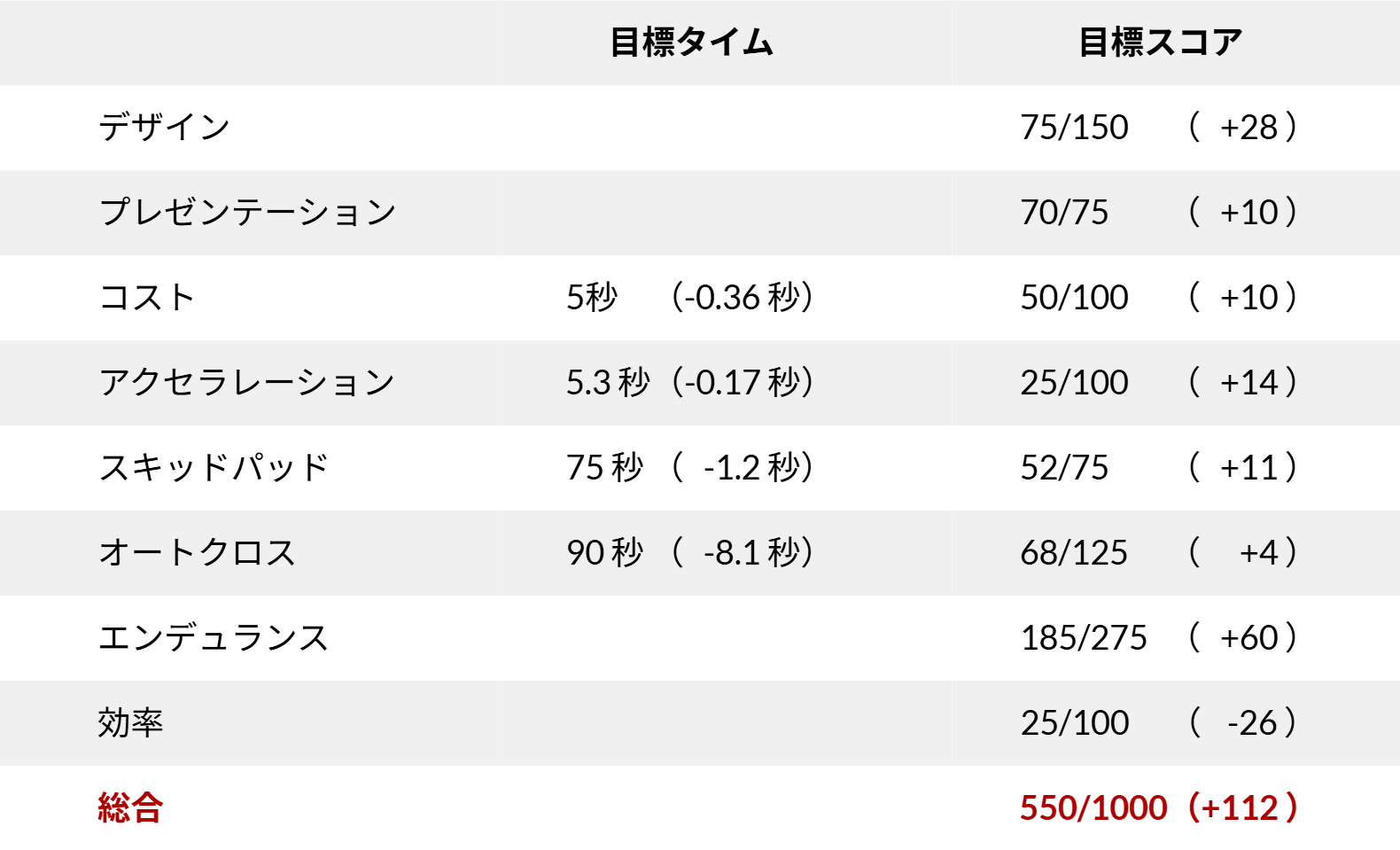 25年度大会では、EV部門総合成績4位と5位の間にスコアの大きな壁がありました。そこで、26年度はまず中堅層のトップである5位を目標とし、27年度以降、さらに上位を目指します。5位達成のためのスコアは550点程度であると考え、以下の表に示す通り、各審査の詳細目標を決定しました。